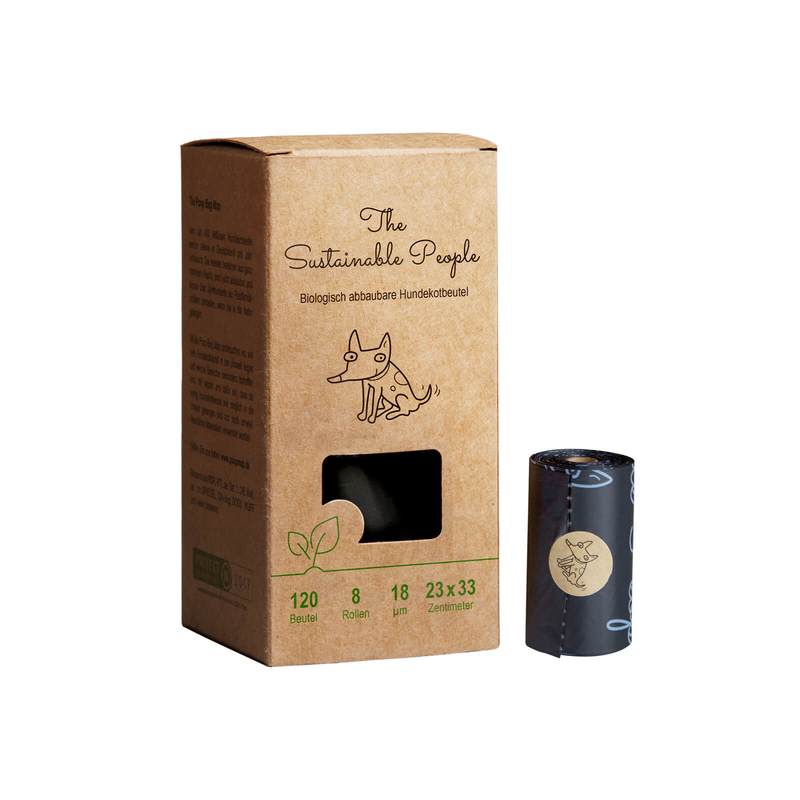 8 Rollen à 15 Beutel = 120 mattschwarze Bio-Kotbeutel im umweltfreundlichen Karton